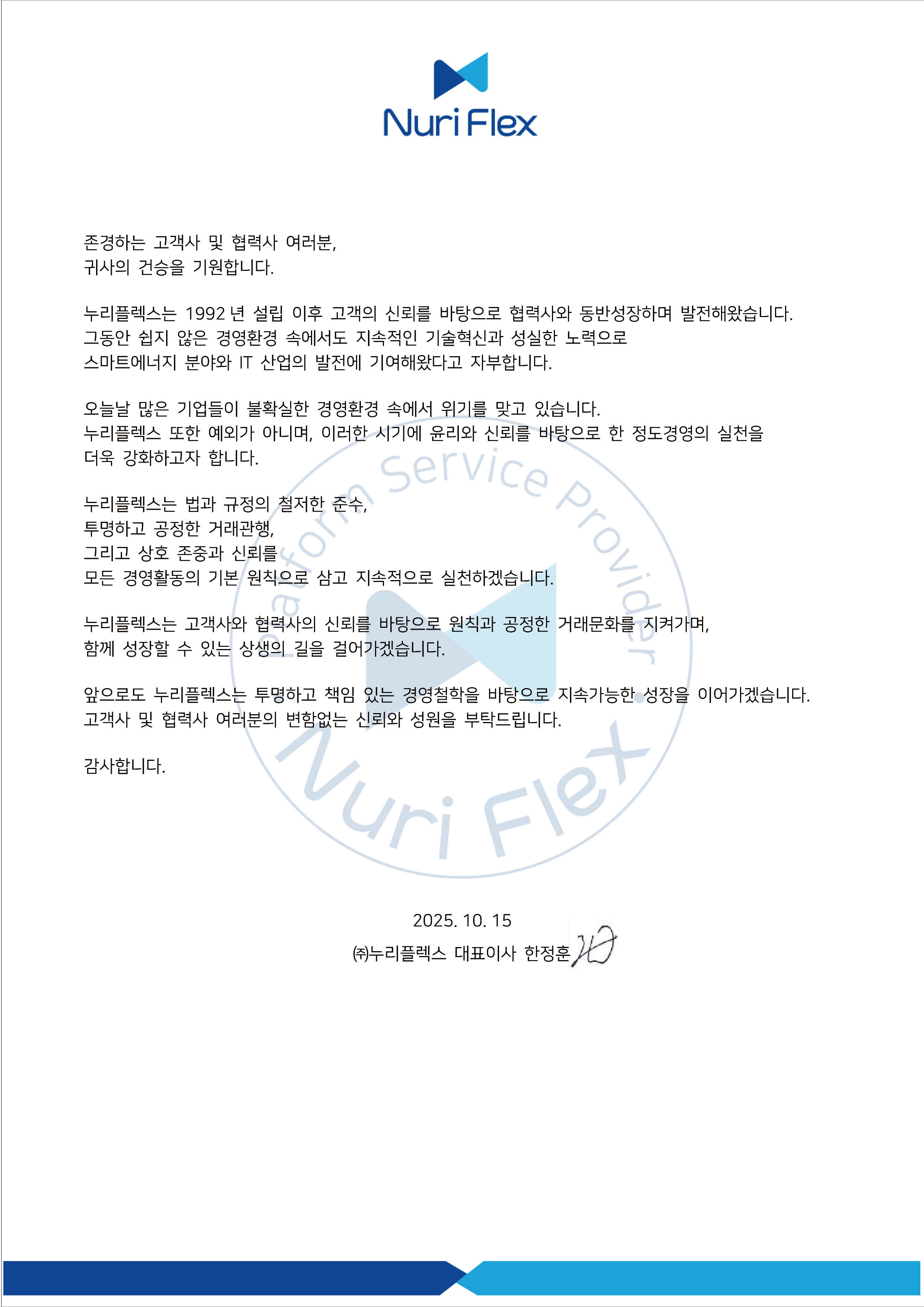누리플렉스는 발빠르게 신기술을 적용하여 앞선 기술력과 다양한 사업경험을 바탕으로 유럽, 아프리카, 아시아,중동, 남미지역 등 글로벌 시장으로 진출해 한국의 IT 기술의 위상을 높이는 한편, 스마트그리드 핵심 인프라인 AMI를 통해 사물인터넷 세상을 열어가고 있습니다.